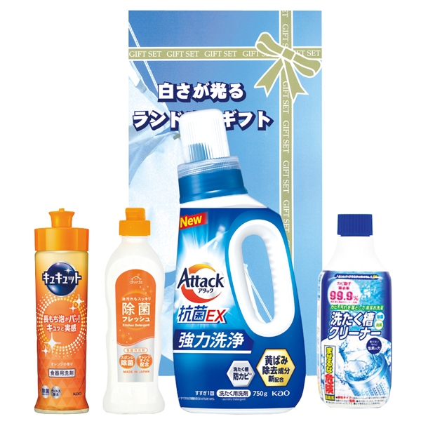 アタック抗菌EX750g、洗濯槽クリーナー400g、キュキュットオレンジ220mL、台所洗剤除菌フレッシュ240mL