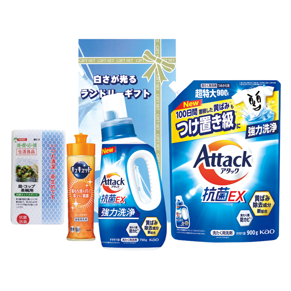アタック抗菌EX(本体750g・詰替〈超特大〉900g)、キュキュットオレンジ220mL、食器用スポンジ