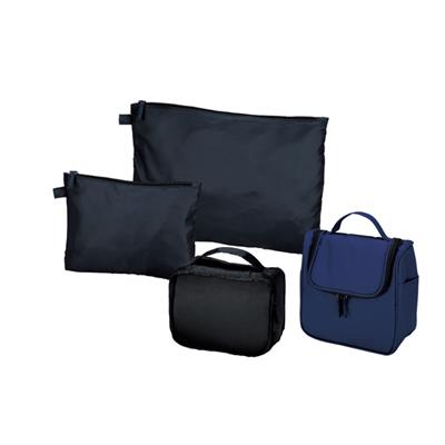 トラベルポーチ230×220×100mm、インナーケース(大)260×380mm、メッシュケース(小)190×240×100mm、インナーケース(小)190×260mm、トラベルポーチ:開閉部(両スライダー付きファスナー式)、外側(ファスナー式ポケット×1・オープンポケット×2)、内側(ファスナーポケット×2・オープンポケット×4)、小物固定用ゴムベルト×5、吊り下げ用フック付き