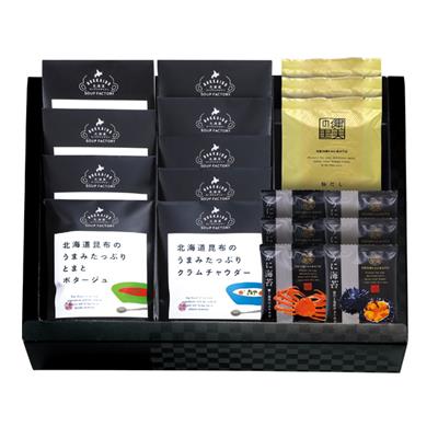 北海道昆布うまみたっぷり(たまねぎスープ×3・じゃがいもポタージュ・コーンポタージュ・とまとポタージュ・クラムチャウダー・えびビスク・かにビスク)・極だし6g×3・ふりかけ(かに海苔・うに海苔)2g×各3 【卵・乳成分・小麦・えび・かに】