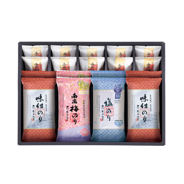 金賞 有明海産南高梅のり(8切6枚)×2・銀賞 有明海産塩のり(8切6枚)×2・味付のり(8切6枚)×4・南高梅個包装×10 【乳成分・小麦・えび・かに】