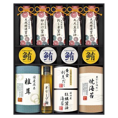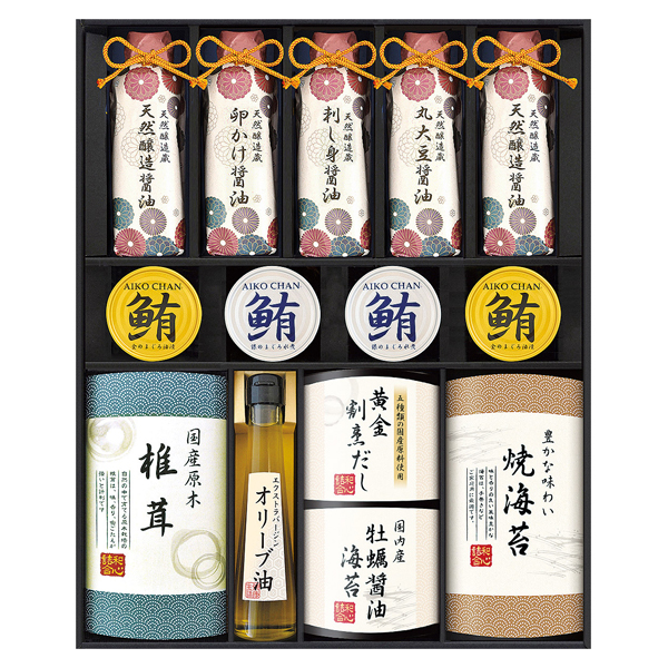 天然醸造醤油200mL・金のまぐろ油漬け70g・銀のまぐろ水煮70g各2、焼き海苔(板のり3枚)・かき醤油海苔(8切6枚)・卵かけ醤油200mL・刺し身醤油200mL・丸大豆醤油200mL・黄金割烹だしパック(4袋入)・エクストラバージンオリーブオイル100g・国産原木椎茸25g各1