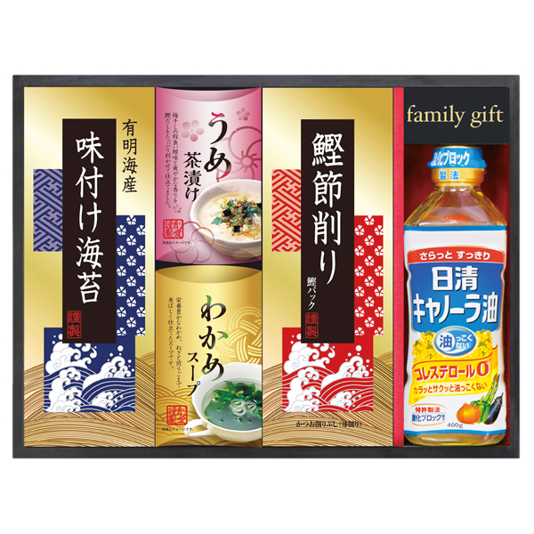 有明海産味付け海苔(3切6枚)・うめ茶漬け(4.3g×2袋)・わかめスープ(5.3g×2袋)・鰹節削り(2g×4袋)・日清キャノーラ油400g 【乳成分・小麦・えび】