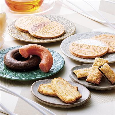 ゴーフレット(バニラ・チョコ各3)、焼ドーナツ(チョコ・ストロベリー各1)、アーモンドパイ・ショコラスティックパイ各2
