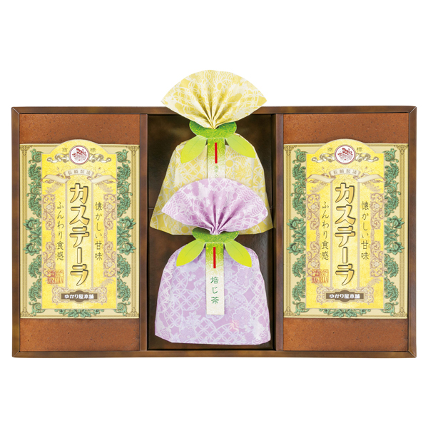 カステーラ(7切入)×2、ティーバッグ(抹茶入玄米茶2袋・ほうじ茶2袋各1)