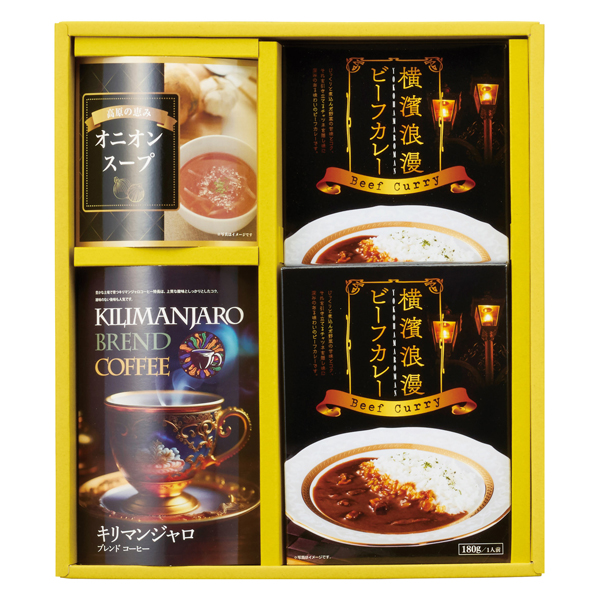 横濱浪漫ビーフカレー180g×2、キリマンジャロブレンドドリップコーヒー(6袋入)・オニオンスープ(3袋入)各1
