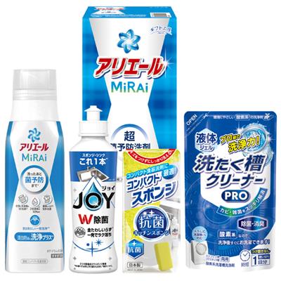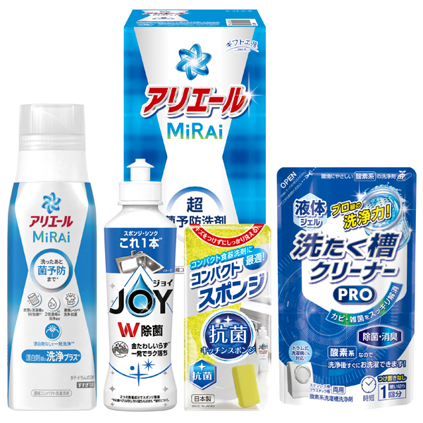 アリエールミライ330g、除菌ジョイ170mL、コンパクトスポンジ、液体洗たく槽クリーナーPRO200g