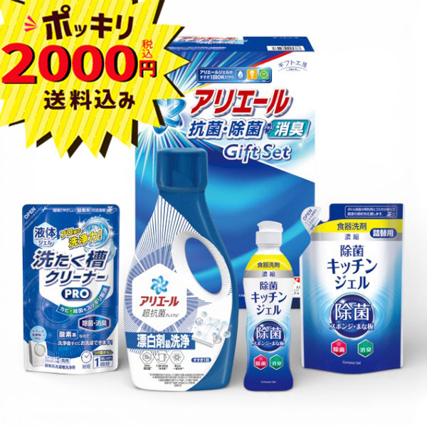 抗菌洗剤アリエールと、少量でたくさん洗える濃縮タイプの食器洗剤除菌ジェル、室内干しのイヤなニオイを防ぎ、ふっくら柔らかく仕上がる抗菌・消臭ソフターのギフトです。