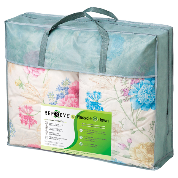 側地/ポリエステル85%、綿15%(再生ペットボトル繊維リプリーブ使用)、詰めもの(0.25kg)/ダウン50%・フェザー50%(リサイクルダウン使用)