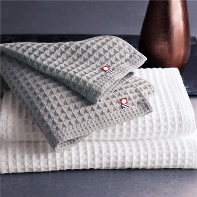 「ワッフル織」で織られたタオルは、さらりとした肌触りと優れた吸水性が特長です。風合いと織目の美しさを損ねないよう、程よいバランスで設定した3種類の糸を使用しています。
