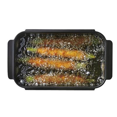 少ない油で節約できる角型タイプの揚げ鍋コンパクトに収納できる角型なので収納のデッドスペースなどにスッキリ収まる。長めの具材がゆったりと揚げやすい内側は長辺が約20cmあるので、アスパラの肉巻き(4本)やエビフライ(3本)、とんかつ(1枚)も揚げられる。