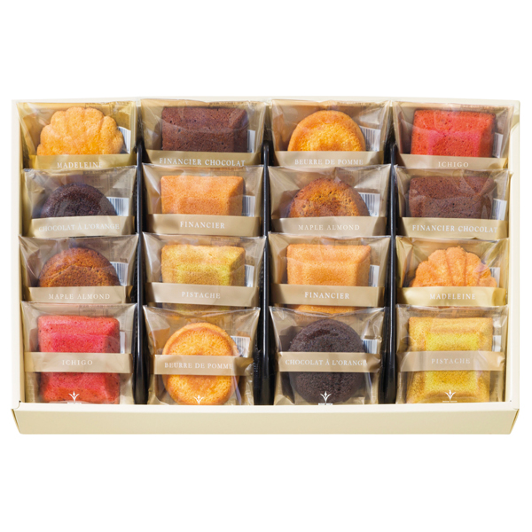 ■商品内容: | (メープルアーモンドケーキ・いちごバターケーキ・チョコオレンジケーキ・りんごバターケーキ・マドレーヌ・フィナンシェ)各2、フィナンシェ(ピスタチオ・ショコラ)各2 【卵・乳成分・小麦】 |