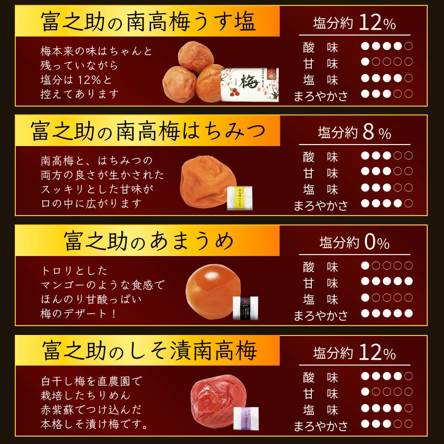 富之助のしそ漬南高梅(8g×2)・富之助の南高梅うす塩味(8g×2)・富之助の白干南高梅(8g×2)・富之助のあまうめ(8g×2)・千莉菴の天の梅(8g×4)
