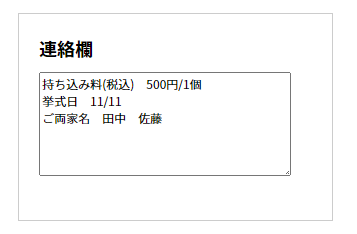 カート画面(ステップ4)の連絡欄に1個の持ち込み料(税込)・挙式日・ご両家名をご入力下さい。
